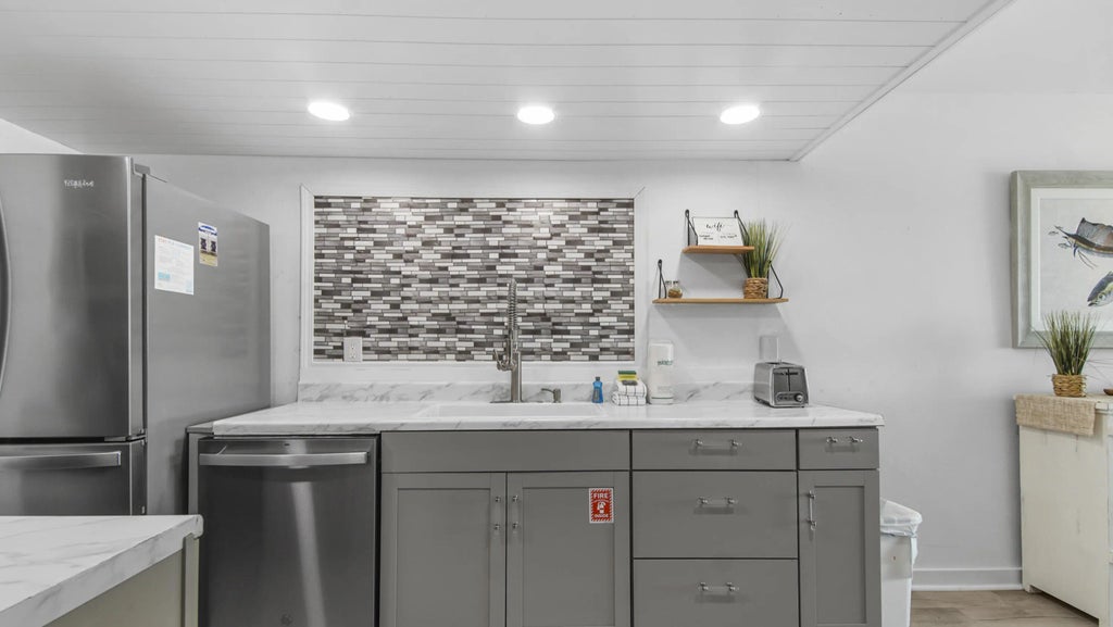 COMPLETELY RENOVATED INTERIOR & EXTERIOR - STUNNING, 2BR/3BA GULF FRONT TOWNHOME WITH NO HOA FEE ON WEST END OF PCB. UPGRADES: All stainless appliances (microwave, double door refrigerator, range & dishwasher), Cabinets, hardware, countertops, backsplash, sink, faucets, garbage disposal, & stackable washer/dryer. (GE electric 3.8-cu ft washer and 5.9-cu ft dryer). All furniture, artwork & decor. Coffee bar. All exterior siding, (front & back of unit) & all exterior painted. Removed all 1st floor decking, installed new deck and added water proofing material, added sand deck, replaced living room level deck and upstairs bedroom balcony decking with new wood & painted all. Installed engineered wood plank. 2nd floor. HVAC, Full replacement of all metal door frames & sliding glass doorsupstairs & downstairs. Front door metal overhead, decking & ring camera. Replaced full electrical breaker box panel and breakers. Removed all interior flooring and installed engineered wood plank. All light fixtures, ceiling fans, & lights. All bathroom vanities, sinks, countertops, showers & hardware. Redid ceilings, added shiplap on kitchen ceiling and master suite, interior fully painted. Step out your back door to your own private deck and into the sugary white sandy beaches and emerald coastline. Enjoy the incredible sunset views from Gulf front living area, kitchen & master suite! By Pier Park shopping, entertainment and restaurants. Great for primary, second home or short-term vacation rental. There are only 9 townhomes at Seagull Beach. They rarely come on the market. Don't miss out on this one!