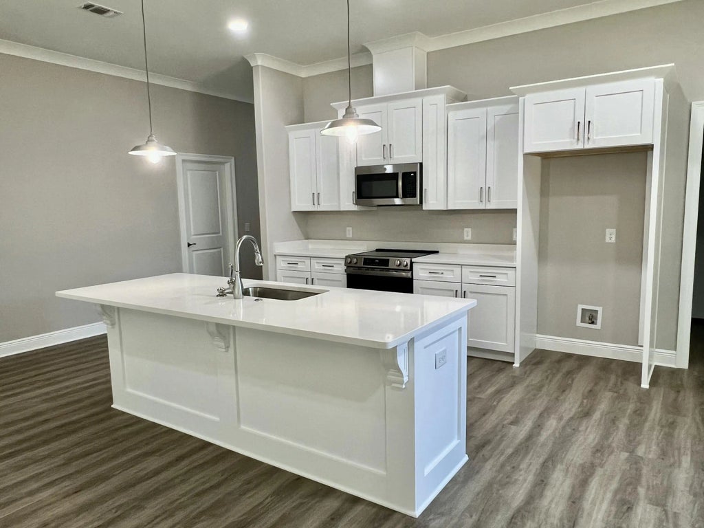 NEW CRAFTSMAN Custom Built Home ~ this luxurious 3 bed/2 bath floor plan end home of 4 new builds is MOVE IN READY~Great Central Location with easy access to Navarre Beach, Navarre Waterfront Park and Hwy 98 to Hurlburt Field AFB.This Stunning Robbins Builders Home offers trend setting features~Greeted by a walk in foyer sweeping through to your open floor plan ~Large kitchen enjoying custom cabinets with crown molding, beautiful quartz counter tops~under mount sink~S/S appliances, large double door pantry & closed off utility room ~sleek top center Island with pendant lights ~open flow to the family room with patio doors out to the large covered porch .Wood look LVP throughout with tiled bathrooms~ Large master withtrey ceiling /ceiling fan and large walk-in closet ~master bath offers an oversized TILED shower ~ double vanity with picture frame mirrors. Additional Bedrooms are a great size with double closets and ceiling fans~Home has a welcoming covered front porch and large covered back porch to sit out and enjoy those wonderful Florida evenings ~great to cook out and entertain. Grassed yard with irrigation system for easy care in the summer months. TAEXX in wall pest control system~ Hurricane protection for windows and dimensional shingle roof for lower insurance premium. Upgrades throughout include recessed lighting, bedroom fans, crown molding, deluxe lighting package,50 Gallon water heater, garage door remotes, attic drop down stairs~ to name a few.....Call today for further information.