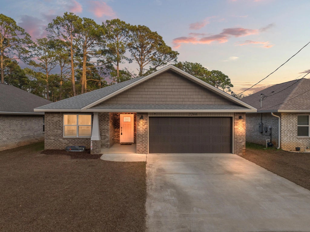 NEW 2023 ALL-BRICK HOME - MOVE-IN READY! Nestled at the end of a quiet street among other new homes, this 3-bed, 2-bath gem offers modern elegance with crown molding, stylish lighting, and low-maintenance vinyl plank flooring. The gourmet kitchen features premium granite counters, gray shaker cabinets, stainless steel appliances, a coffee station, eat-up bar, and corner pantry. The primary suite boasts a recessed ceiling, dual sinks, a tiled shower with bench, and a spacious walk-in closet. Enjoy a privacy-fenced backyard with room for a pool and a covered back porch. Extras include hurricane fabric shields, a sprinkler system, a large laundry room with cabinetry, and a bonus nook. No HOA! Minutes from Hurlburt AFB, Navarre Beach, shopping, and top-rated schools. Call today!