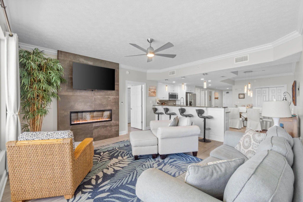 As you walk into the foyer, you are graced with a beautiful custom marble inlay to set the tone for the rest of the unit. The open-concept kitchen boasts contemporary white cabinetry, granite countertops, stainless-steel appliances with a new stove/oven unit and dishwasher, custom pendant light fixtures, recessed lights and pantry. Within the same space is your dining area with ample sitting, custom light fixture and built-in twin-over-twin bunks with a ladder. Adjoining the space is your large living room offering endless gulf views with the ONLY custom built 52-inch fireplace in the entire complex. Open up the glass sliding doors not only in the living room, but also the primary suite to enjoy the beach air on your almost 30 foot long balcony that gives you plenty of space of casual sitting and dining options.