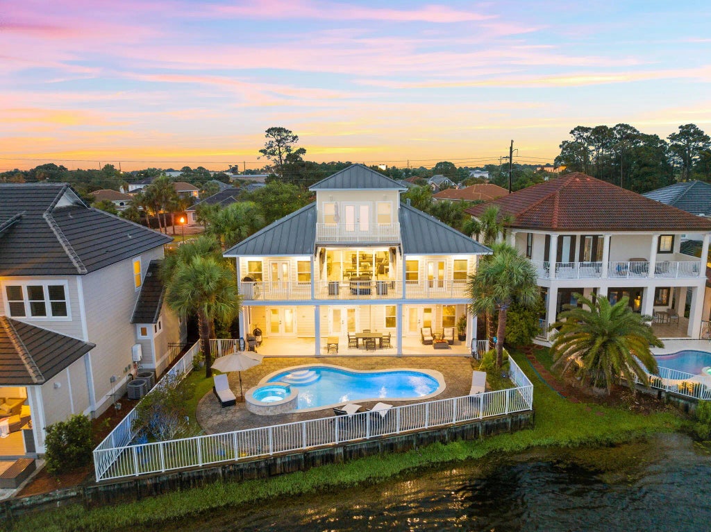 Back on the market as Buyer couldn't perfrom. Priced below rebuild cost--seller says sell as has relocated and moved on. Best value in Destiny communities. This fully furnished ICF constructed 7BR/ 4.5BA lakefront home with Gulf views offers over $230K+ in rental projections and $400K+ in recent renovations and upgrades. Located in gated Destiny East, it's ideal for STR investors or luxury buyers. Enjoy stunning lake and Gulf views from all 3 floors, spacious outdoor living with lake side pool, elevator access to all three levels, and a private first floor in-law suite with kitchen and laundry. Turnkey and STR-ready including a streeet legal golf cart--perfect for large families or multi-gen groups. Home has This is a must see for anyone cosndiering a home in this location and price point.mother-in-law suite with a kitchen and laundry area. The oversized three-car garage includes new doors and openers, and a street-legal golf cart is also included. Outdoor spaces are designed for maximum enjoyment, with a lakefront pool featuring upgraded lighting and safety alarms, expansive decks, outdoor TVs, a retractable awning, a natural gas firepit, and a built-in BLAZE BBQ, all with beautiful Gulf and lake views, plus spectacular sunsets. The home has undergone a full-scale renovation, including new flooring, fresh interior and exterior paint, mostly dimmable lighting, new doors, and window coverings. Both kitchens and all bathrooms feature new quartz countertops, and the entire home includes brand-new appliances, updated HVAC systems with mini-splits and a heat pump, and a new washer and dryer. Bathrooms have been completely remodeled with new tile, custom showers, fixtures, and mirrors. A custom 14-foot hurricane-rated sliding glass door opens up to panoramic lake views. The home comes fully furnished, with many pieces never used, including custom artwork and a 120-inch projector TV. Additional features include a hard-wired security camera system, central vacuum, and pool safety features compliant with rental regulations. Destiny East offers gated security and resort-style amenities including a clubhouse with pool and spa, fitness center, movie theater, two tennis courts, a playground, and convenient beach access via golf cart. Whether you're looking for a luxury vacation home or a high-performing short-term rental, this property offers turnkey convenience, modern comfort, and exceptional value. Don't miss your chance to own this lakefront gem.
