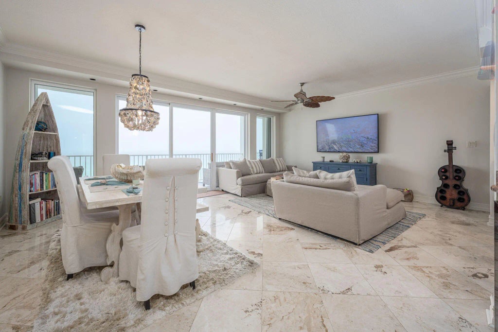 Experience coastal living like never before in this spectacular beachfront end-unit condo, perfectly positioned on the 3rd floor with breathtaking, unobstructed Gulf views from nearly every room. From the moment you walk in, the panoramic beauty of the beach draws you in--captivating your eyes and soothing your soul.Step onto the expansive 50-foot tiled balcony, accessible from the living area and both bedrooms, and soak in sweeping sunrise and sunset vistas that stretch across the horizon. Whether you're sipping your morning coffee or unwinding with an evening glass of wine, this space becomes your personal slice of paradise.This 2-bedroom, 2-bath luxury retreat offers an open-concept layout designed for entertaining, featuring elegant marble flooring, a built-in wetbar with wine cooler, and a seamless flow between the living, dining, and kitchen areasall with uninterrupted Gulf views. The chef's kitchen is equally impressive with granite countertops, stainless steel appliances, timeless sophisticated cabinetry crafted for both beauty and durability. The convenient adjacent laundry room with sink doubles as a pantry and utility area. The split style bedroom affords enhanced privacy for both homeowners and guests. The guest bedroom is generously sized, ideal for relaxation or even a flexible sitting or office space, and opens directly onto the balcony. The guest bath offers a beautifully tiled walk-in shower and private vanity area. The primary suite is a peaceful sanctuary, beginning with a spacious dressing area and leading into a luxurious bath featuring a jetted tub/shower combo with handheld option, dual granite-topped vanities, and serene views that start every day with inspiration. Additional features include a rare, hard to find 2-car tandem garage PLUS a private storage unit, and additional space at the back of the building for your beach essentials. Yes, you have found a unicorn on the beach. Compass Rose is a sought-after Gulf-front community offering 300 feet of private beach, a fitness center, a rooftop observation deck, a children's play area. Do the beach VIP style with seasonal beach service (March-October)all included in your HOA dues. This is the way life is suppose to be. You have earned it. Rental Policy: Minimum 31-day rentalno short-term staysensuring a peaceful mor private atmosphere without the constant turnover of vacation traffic. Enjoy a true coastal lifestyle among like-minded neighbors.
