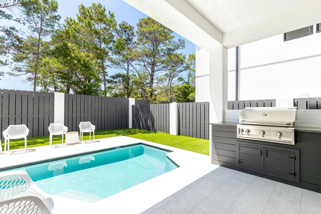 Rare new construction under $2M just off 30A. Seacroft Cottages is an exciting new 14 home subdivision conveniently tucked just off County Hwy 393 and a short stroll from all 30A has to offer including ultra-happening Shunk Gulley restaurant and 30A's widest public beach access at Ed Walline Park. No wonder this ''has it all'' home is projected to produce over $250K per year in vacation rental income. Your own private pool with hot tub and spillover water feature, grill and alfresco dining sits just off a private lounge with Marvel wine cooler for first floor convenience.A charming guest bedroom with private bath and bunk room with its own full bath offer quick outdoor access. One of two stackable Electrolux washer/dryer closets service the first floor. An expansive main living space well-positioned on the second floor with a deep balcony. Gather up around the chef's kitchen or spill on over to the comfy living area. This house says bring the crowd on in. The inviting gourmet kitchen for the chef in the group includes a high-end stainless steel Viking appliance suite with a six-burner gas stove, gorgeous marble countertops and bar seating for 4. A large pantry with built-in shelving adds extra storage. The adjacent dining area can accommodate a large table for gatherings. One of the two second-level bedrooms has a private bath. The third floor houses the primary suite with a private bath and balcony access with two additional bedrooms, both with a private bath. A large lounge area offers additional space for everyone. Located adjacent to Gulf Place entertainment district. Santa Rosa Golf club is a five-minute drive and offers some of the area's best semi-private play. Designer furnishings are negotiable.