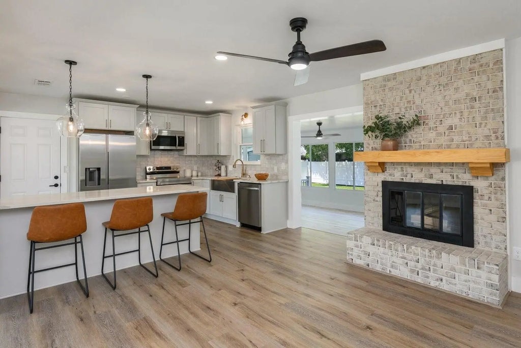No more boxy, closed-off rooms! Instead OPEN-CONCEPT LIVING achieved, with knotty pine wood beam and recently-refurbished brick fireplace and matching knotty pine mantel.