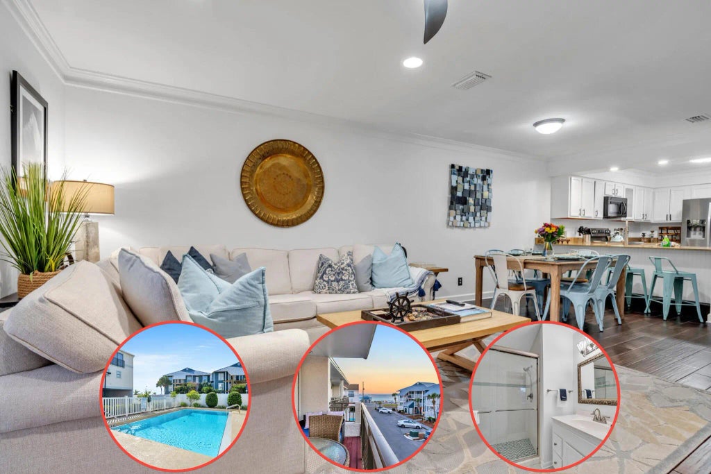 Beach life at an affordable price rings true with this townhome located across the street from the beach with GULF VIEWS! Covered parking for two vehicles and a small grassy area make this townhome a very unusual find! Conveying completely furnished this property features LVP floors throughout, stainless steel appliances, coastal tiled walk in master shower, built in bunk beds, and much more! Not one but two balconies is where sunset dreams come true! Low HOA dues, only 10% down needed for financing, a beautiful setting and a community pool make for a prime opportunity! For those looking for an investment opportunity this home already has lots of bookings on the calendar for summer and fall of 2025!