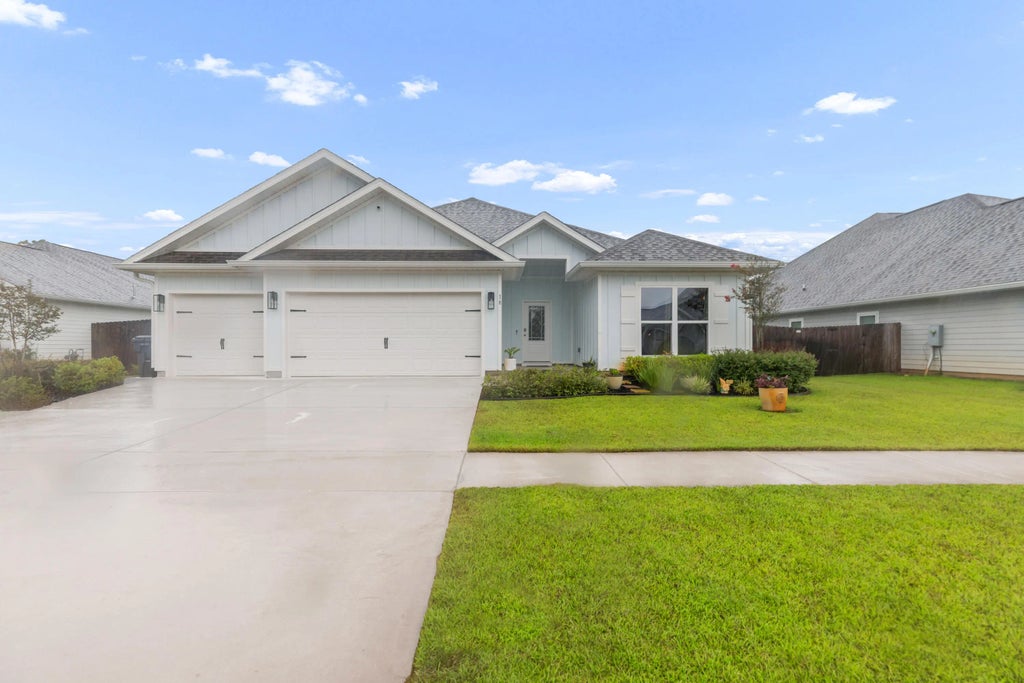 Welcome to 18 Hammock Circle in sunny Freeport, FL! $5k Seller incentive with full price offer! This thoughtfully designed 4 BR, 3 BA home features a three car garage with large, level, fenced backyard on a beautiful pond in Hammock Oaks. You are greeted by an extra-wide foyer with shiplap accents and a convenient drop zone. The heart of the home is the living area which centers around a quality custom tile-surround fireplace and mantel. Living flows into kitchen complete with quartz countertops, ample cabinetry, generous corner pantry and stainless appliances. The primary suite offers his and hers walk-in closets and a luxurious bath with dual vanities, framed mirrors, soaking tub and separate shower. A large back patio is covered and screened with an additional open patio also. Add-itional concrete pad on side of home if shed is desired. Spacious laundry room, LVP flooring throughout, and lots of storage make this house both beautiful AND organized. The yard is irrigated and fully fenced with privacy fencing on sides and black aluminum fencing and gate on the back of the property to enjoy the water view. Plenty of room for a pool. Just 19 miles from the sugar-white sands of 30A where scenic beach towns, local boutiques and delicious dining await in places like Blue Mountain Beach, Seaside, Alys and Rosemary! Buyer to verify all dimensions and information important to them.