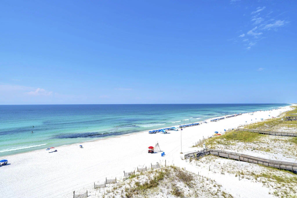 TOP FLOOR UNIT-2 OWNERS-NEVER ON SHORT TERM RENTAL PROGRAM.This rare top-floor, 3-bedroom, 2.5-bath condo has never been on the short-term rental market and has only had two owners--meaning you'll enjoy a home free of the typical wear and tear found in many vacation rentals. Whether you're looking for a full-time residence, second home, or future rental property, this condo offers the best of both worlds: pristine condition and incredible potential.The kitchen and dining area feature a custom built-in buffet--perfect for storing larger kitchen appliances or entertaining essentials. It also includes a built-in desk, ideal for working remotely.The Master bedroom has a gulf view and is large enough for a king bed and oversized dressers. Plus, there is his and her closets.The master bathroom is very functional with a granite top vanity and a spacious walk in tile shower; both full bathrooms are walk in showers. The third bedroom offers flexibility with a huge walk-in closetgreat for extra storage or as a lockable owner's closet if you choose to rent. Off the elevator there is even more storage a 6 x12 x10 storage space. The perfect place to store holiday decorations or overflow beach gear. Let's not forget about the view!!!! TOP FLOOR unobstructed east and west views! Other features: Maximum wind strength sliding glass door and window with electric shades in the master bedroom and living room- with 1 hit of a button your shades will draw to and block any unwanted sunlight. Tile flooring throughout. HVAC 2024, Water Heater 2020. Average electric bill: $100 *Owners are allowed to park 2 cars in owners covered parking* *Parking is first come first serve*