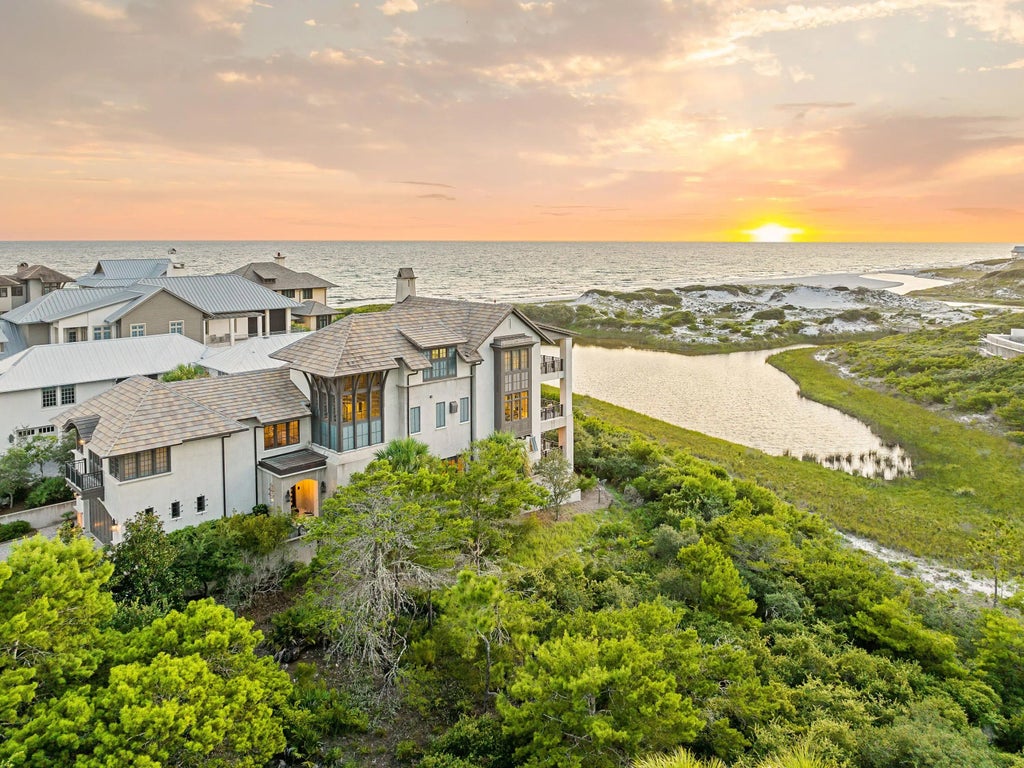 Perched on one of the most elevated lots in The Retreat, this exceptional residence offers a vantage point unlike any other along Scenic 30A. From its commanding position, the home unveils a rare panorama of Draper Lake, one of Florida's treasured coastal dune lakes, framed by the sculpted white dunes and the endless horizon of the Gulf. The layered beauty of lake, dunes, and Gulf is a view almost never found -- and it sets this property apart as one of the most coveted homesites in the community. Designed by renowned architect Tom Christ and built to Fortified Home Construction Standards with steel-reinforced concrete and a concrete tile roof, it offers enduring strength paired with timeless elegance. Balconies on each level provide outdoor living space with sweeping coastal views, whilethe interiors combine quality craftsmanship with everyday comfort. The second floor is the heart of the home, where soaring ceilings, rich hardwood floors, and a stone fireplace anchor a warm yet sophisticated living space. A chef's kitchen stands ready for entertaining with dual islands, Thermador appliances, and quartzite countertops. The main level also includes a guest suite, office/bonus room with en suite bath, and a powder room. The third floor is devoted to a spectacular master suite, where sweeping views of Draper Lake, the dunes, and the Gulf create an atmosphere of serenity. Custom his-and-hers closets with a built-in safe, a private den with fireplace, and a secondary laundry complete this private retreat. The first floor adds three guest suites, all with en suite baths, a bright courtyard, a practical mudroom connected to an outdoor shower for quick cleanup after beach and lake adventures, and a cedar closet. Unique amenities include a climate-controlled wine room and a heated and cooled storage room large enough to serve as a personal gym or wellness studio. Beyond the home itself, this lot is recognized as one of the finest within The Retreat, a gated enclave celebrated as the most private and pristine community on 30A. Residents enjoy more than 3,000 feet of private Gulf frontage, a world-class pool and beach club, access to Draper Lake for watersports with a boathouse for kayak and paddleboard storage, and an expansive protected natural buffer that ensures lasting privacy. This is more than a home it is a rare legacy property, blending elevated coastal living with the unmatched exclusivity of The Retreat.