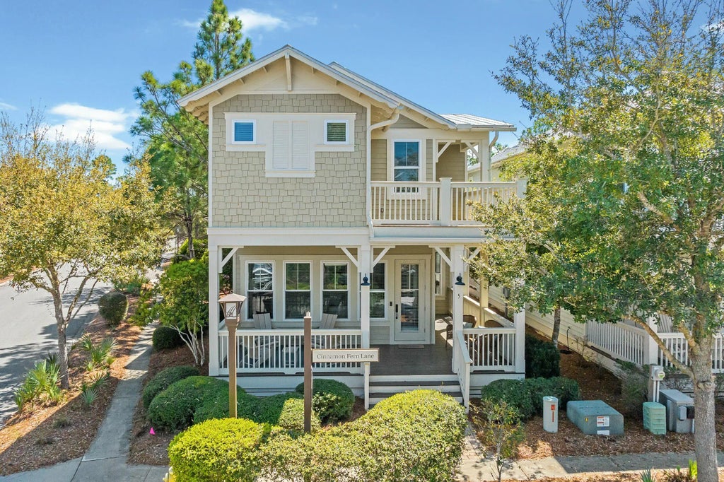 Welcome to 5 Cinnamon Fern, a beautifully maintained coastal retreat in the sought-after NatureWalk at Seagrove community. This prime corner homesite is just over the neighborhood's iconic wooden bridge, offering a serene backdrop while being steps from the community pool and a scenic path to Publix and the WaterColor shopping center. Backing to lush woods for privacy, this well-maintained home boasts a strong rental history, making it a fantastic investment opportunity or personal retreat. It features a golf cart barn with additional temperature-controlled storage and convenient overflow parking nearby. The inviting wraparound porch sets the tone for relaxation, leading into a bright, open living space with wall-to-wall windows, solid pine floors, and elegant crown molding.The inviting wraparound porch sets the tone for relaxation, leading into a bright, open living space with wall-to-wall windows, solid pine floors, and elegant crown molding. The kitchen is a chef's delight, boasting upgraded cabinetry, a custom vent hood, and a dual-fuel GE stove. With two primary suites, each featuring spa-like baths with dual sinks, separate soaking tubs, and walk-in showers, this home is designed for comfort. Upstairs, a versatile loft area with a daybed, a bunk room, and an additional bedroom share a spacious bathroom with double sinks. The second primary suite offers a private open balcony, perfect for taking in stunning sunset views. NatureWalk is an amenity-rich community with two resort-style pools, pickleball courts, fitness stations, and a scenic trail leading to the sugar-white sands of 30A. Located just minutes from Seaside and the best of the Emerald Coast, yet tucked away for peaceful relaxation, this home is a proven rental favorite and an ideal coastal escape. Don't miss your chance to own a slice of paradise! Schedule your private tour today.