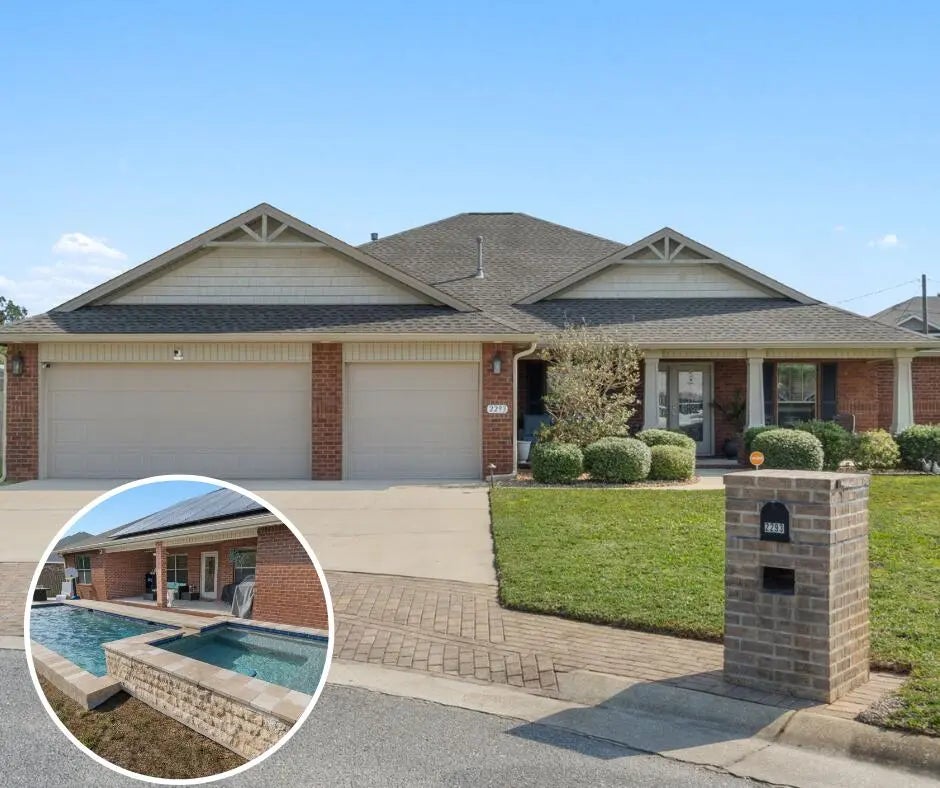 Welcome to your dream POOL home in The Meadows! This stunning 4 bedroom, 3 bathroom all-brick home is tucked away on a quiet cul-de-sac in one of Navarre's most desirable neighborhoods. From the moment you arrive, you'll notice the charming covered front porch, extended driveway, and spacious 3-car garage. Inside, the thoughtful floor plan also offers a formal dining room and a versatile office/flex room behind French doors. The living room features a custom built-in, while the kitchen is a showstopper with granite countertops, stainless steel appliances, and a tasteful backsplash. The oversized laundry room with built-ins serves as a butler pantry for added convenience and storage. The spacious master bedroom is a true retreat, complete with a fantastic en suite bathroom featuring dualvanities, a soaking tub, a walk-in tiled shower with dual shower heads and two walk in closets! The split floor plan features three other great sized bedrooms on the other side of the house, two of which with a full bathroom between them. The 4th bedroom has a walk-in closet and the hallway accessible full third bathroom also has access directly to the back patio, perfect for access to the pool while you're outside having fun. Speaking of which...outdoors your private oasis awaits! Enjoy the custom saltwater gunite pool and hot tub, all overlooked by a covered back patioperfect for relaxing or entertaining year-round and bordered by beautiful palm trees! Additional upgrades include fully paid-off solar panels, a new roof (2021), and a new water heater (2024) for peace of mind. With 4 spacious bedrooms, 3 full baths, and plenty of flexible living space, this home blends comfort, efficiency, and style in an unbeatable East Navarre location close to Hurlburt Field and Navarre's beautiful sugar white beaches. Don't miss your chance to live in The Meadows, schedule your showing today!