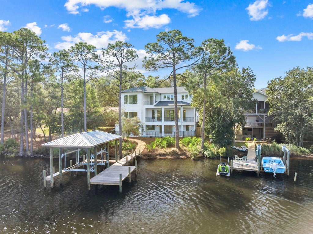 NEW HOME ON LAKE POWELL IN INLET BEACH WITH WATER, WATER, WATER VIEWS EVERYWHERE! Experience extraordinary lakefront living in this stunning 4,432-square-foot, 5 bedroom, 6 bath residence on Lake Powell. Designed with both comfort and entertainment in mind, this home offers a lifestyle unlike any other--where boating to the beach and upscale dining on the east end of the famous highway 30A are all part of your everyday experience. The main level welcomes you with an open concept living, kitchen, and dining area with a master suite, ideal for entertaining while taking in the lake views from the expansive balcony. Downstairs the Lake/Pool level offers a bunk room, a game room, media room, and full bath, perfect for gatherings after a perfect day of boating to the beach.Hardwood and shell stone floors flow seamlessly throughout, adding warmth and elegance to every space. The third floor features an additional master suite, 2 additional bedrooms and 2 bathrooms, each offering serene vistas of the lake and surrounding lush vegetation.