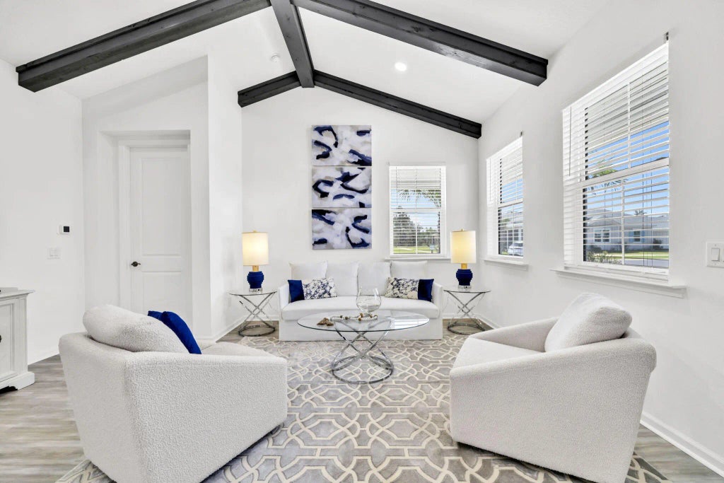Move right into this street-facing Dreamsicle cottage in Latitude Margaritaville Watersound--where 55+ living feels like a vacation every day. This home showcases thoughtful upgrades, including a waterproof high-performance laminate wood floor throughout for a seamless look, a soaring beamed ceiling, designer lighting, and a custom slipcover sofa. The kitchen boasts quartz countertops upgraded to a rare level five with a matching quartz backsplash--an elegant and valuable enhancement. Both showers feature higher-level tile, and a 75-inch TV conveys for added convenience. The spacious wraparound porch has a cool-seal finish for year-round comfort, and the home's placement provides added breathing room with extra space to the side.Located in Section 6BC, a highly active part of the community, residents enjoy Friday happy hours, cookouts, and gatherings at the Flip Flop area. Latitude Margaritaville Watersound also offers world-class amenitiesresort-style pools, fitness centers, restaurants, live entertainment, pickleball, tennis, and an exciting calendar of social events. This cottage blends stylish upgrades, a desirable location, and a vibrant lifestyle, making it a standout in one of Florida's most sought-after 55+ destinations.