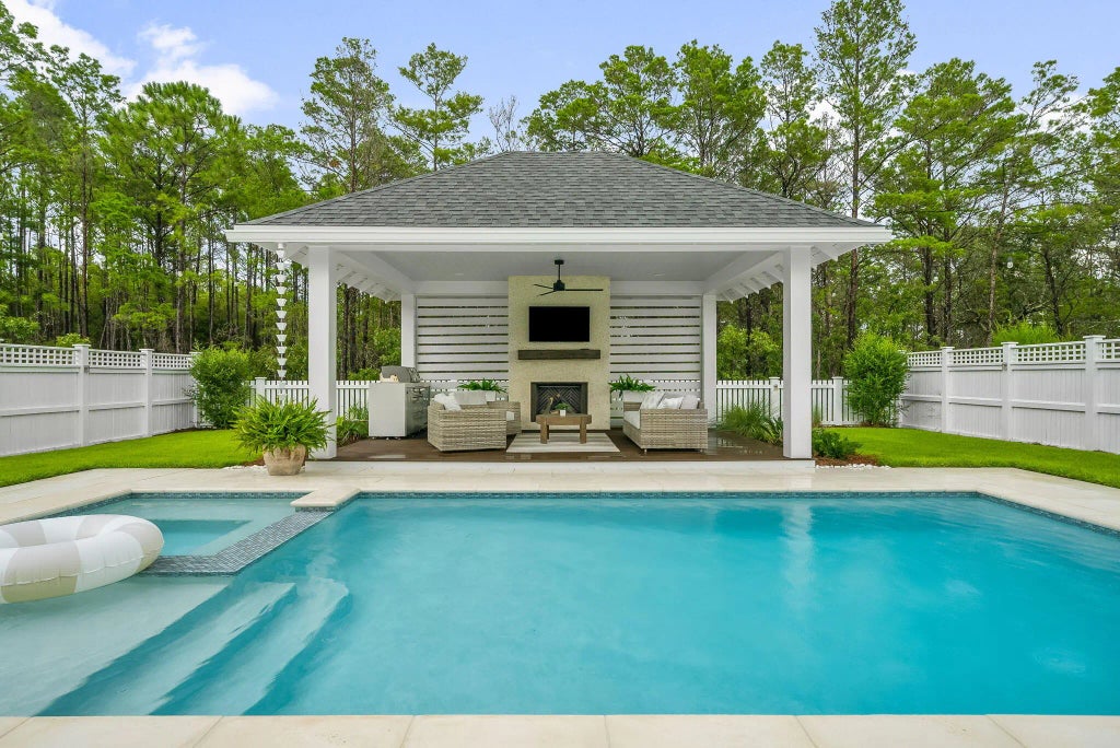 Welcome to 133 E Firethorn Circle, where indoor comfort meets exceptional outdoor living. With over $300k of upgrades, this beautiful, custom finished home offers the perfect blend of privacy, space, and resort-style amenities, highlighted by an oversized backyard retreat that truly sets this property apart. Step outside and experience your own personal paradise: a private heated pool and spa next to a large cabana with a cozy fireplace, ideal for relaxing or entertaining year-round. With over 520 square feet of covered exterior living space, there's plenty of room for al fresco dining, lounging, and hosting guests in comfort and style.Inside, you'll find two first floor en-suite bedrooms, a custom finished kitchen, and large living area with beautiful wood ceiling beams.Upstairs are an additional three bedrooms and two bathrooms. Tucked away on a quiet, low traffic tree-lined street , 133 E Firethorn Circle offers both tranquility and convenience. Watersound Origins offers resort amenities including golf, pickleball, tennis, a fitness center, playground, lake access, and restaurants and shops just a bike ride away. Don't miss the chance to own one of the most unique outdoor living experiences in the area. Schedule your private showing today.