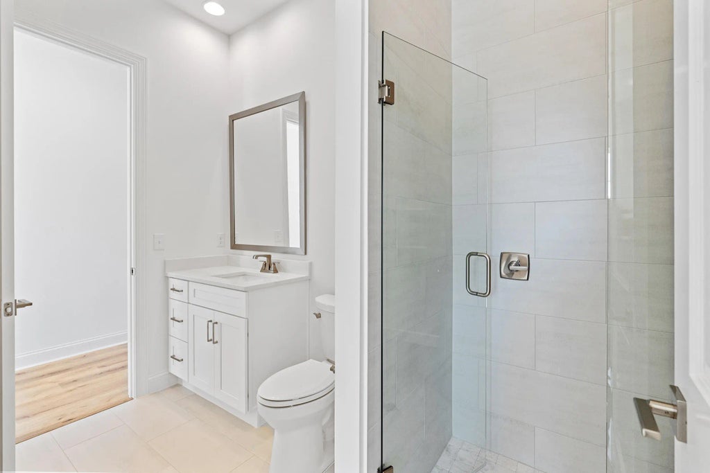 The owner's suite is a serene retreat featuring a tiled shower, quartz-topped dual vanities, and a spacious walk-in closet.